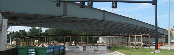 The geometry of the interchange in question dictated a very long span. Typically such a long single-span bridge requires a very deep beam, but this would have never addressed the client's desire for an aesthetically pleasing structure.