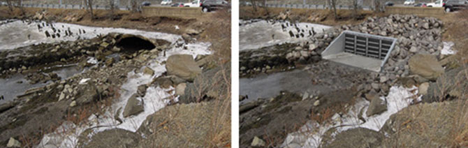 We use PhotoSim work with other engineering services as well. This is a PhotoSim of a proposed technical solution of a tidal flap gate in Beverly, Massachusetts, to mitigate flooding at a 77-acre lakefront corporate campus during a tidal or extreme rainfall event.