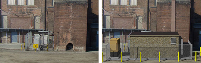 The image below is a PhotoSim we did for a client in Dedham, Massachusetts. The left image is before our digital work, and the image to the right is the final rendering showing a telecommunications shelter, backup generator, fencing, bollards, and cable tray. These images were used by the client to help obtain zoning approval for the telecommunications installation.