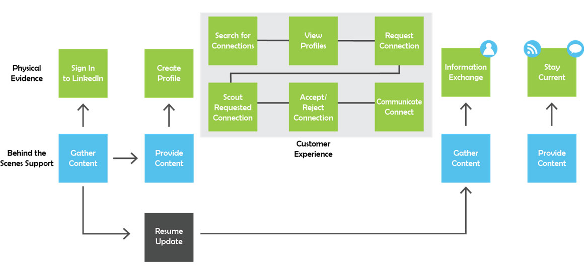 The survey revealed that our firm leaders wanted to get more active on LinkedIn, and were interested in getting help from the local marketing teams. We then built a service blueprint to map service delivery from our leaders' perspectives. This allowed us to define the lines of interaction and identify gaps for improvement. The deconstructed process looked like this: