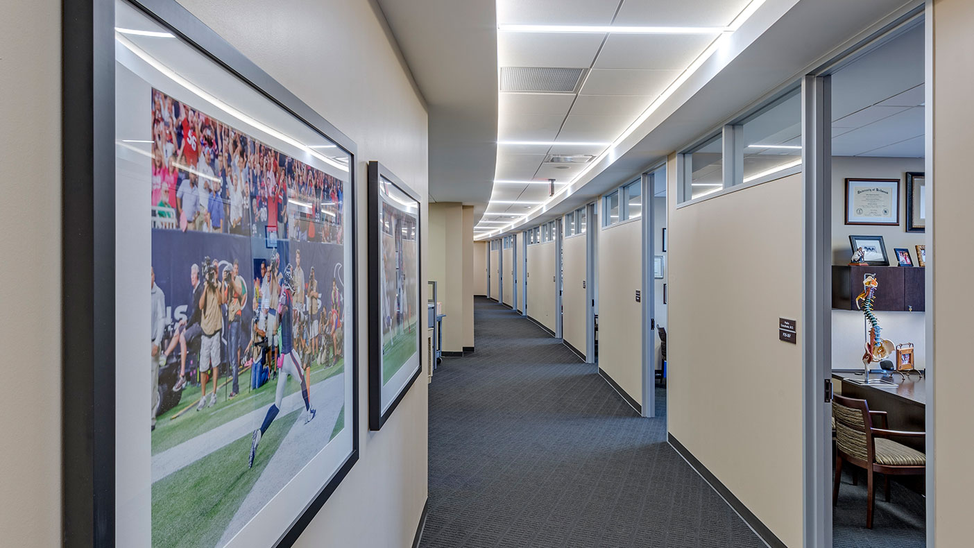 To accommodate a growing practice and consolidate services for the Houston Methodist Hospital Department of Orthopedics and Sports Medicine, we provided planning, architecture, and interior design for the space. A dynamic design featuring sports memorabilia of the region was completed for the clinic spaces, including six exam pods and three x-ray units, conference areas, reception, and large waiting room. Additional spaces included administrative and support areas.
