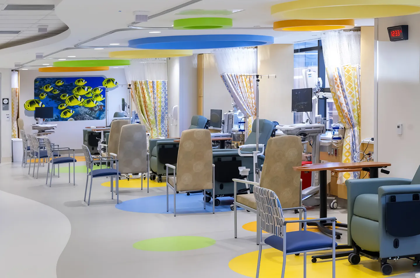 The Texas Children’s Hospital Inpatient and Outpatient Dialysis is a complex and first-of-its-kind project in Texas. It included the renovation of a 23,000-square-foot floor to replace an existing outpatient-only dialysis unit with a centralized inpatient and outpatient dialysis unit. Dialysis is a life-saving treatment for many individuals, and this new combined space makes the process more streamlined for both patients and hospital staff. In addition to better usability, our team also designed the space to be welcoming to child patients who may feel anxious in a traditional hospital space. Colorful furniture and fixtures were included, which match the underwater-themed murals and five aquariums in the reception areas and patient treatment centers and help to contribute to a welcoming and child-friendly space.
