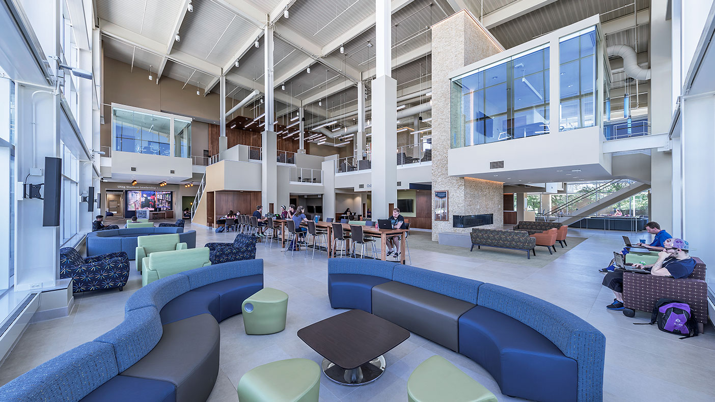 The building is anchored by a prominent student leadership center, food venues, a convenience store, a recreation venue, and a variety of enclosed meeting spaces. These rooms are joined by a flexible social and collaborative spaces that offer different